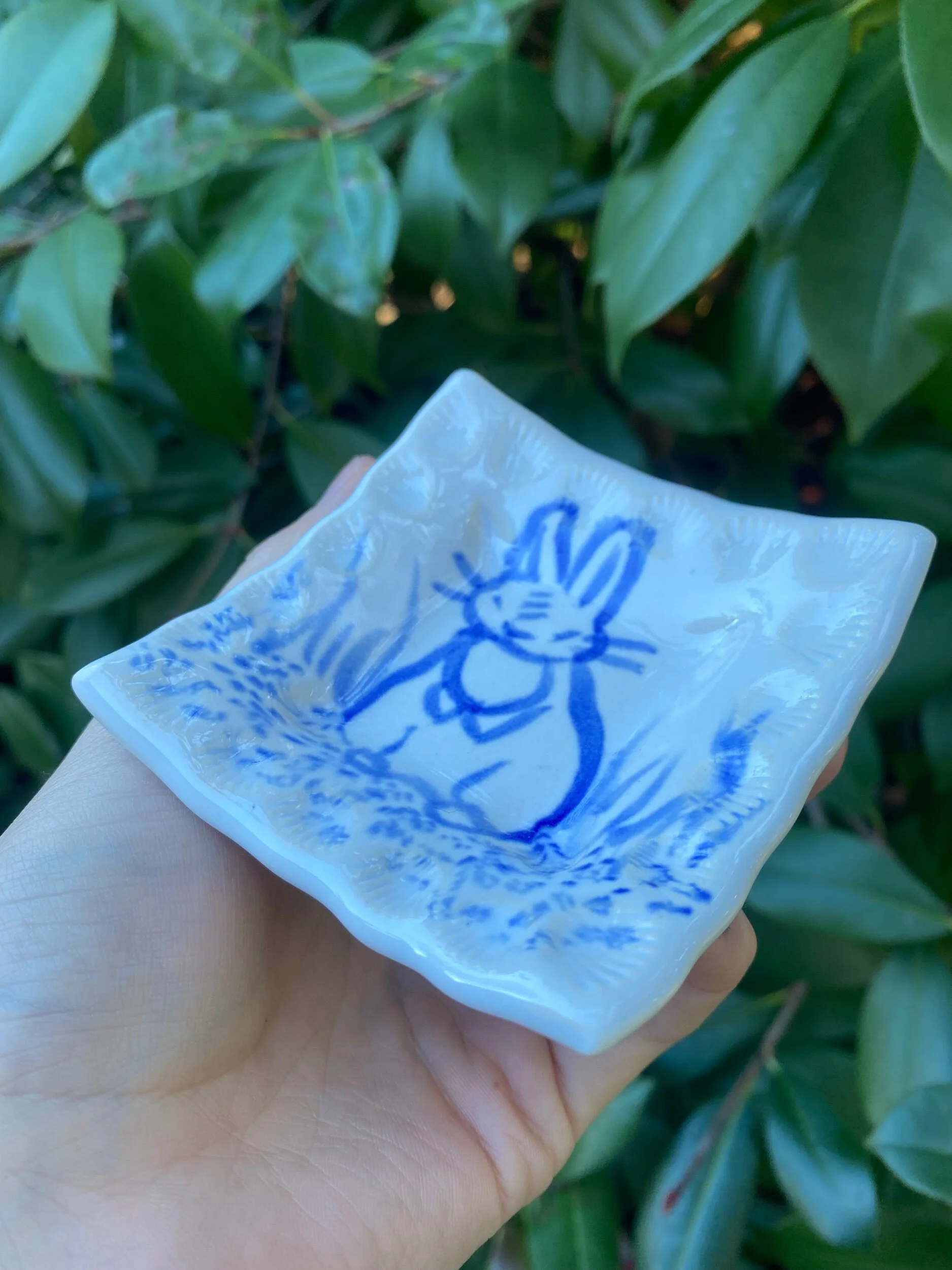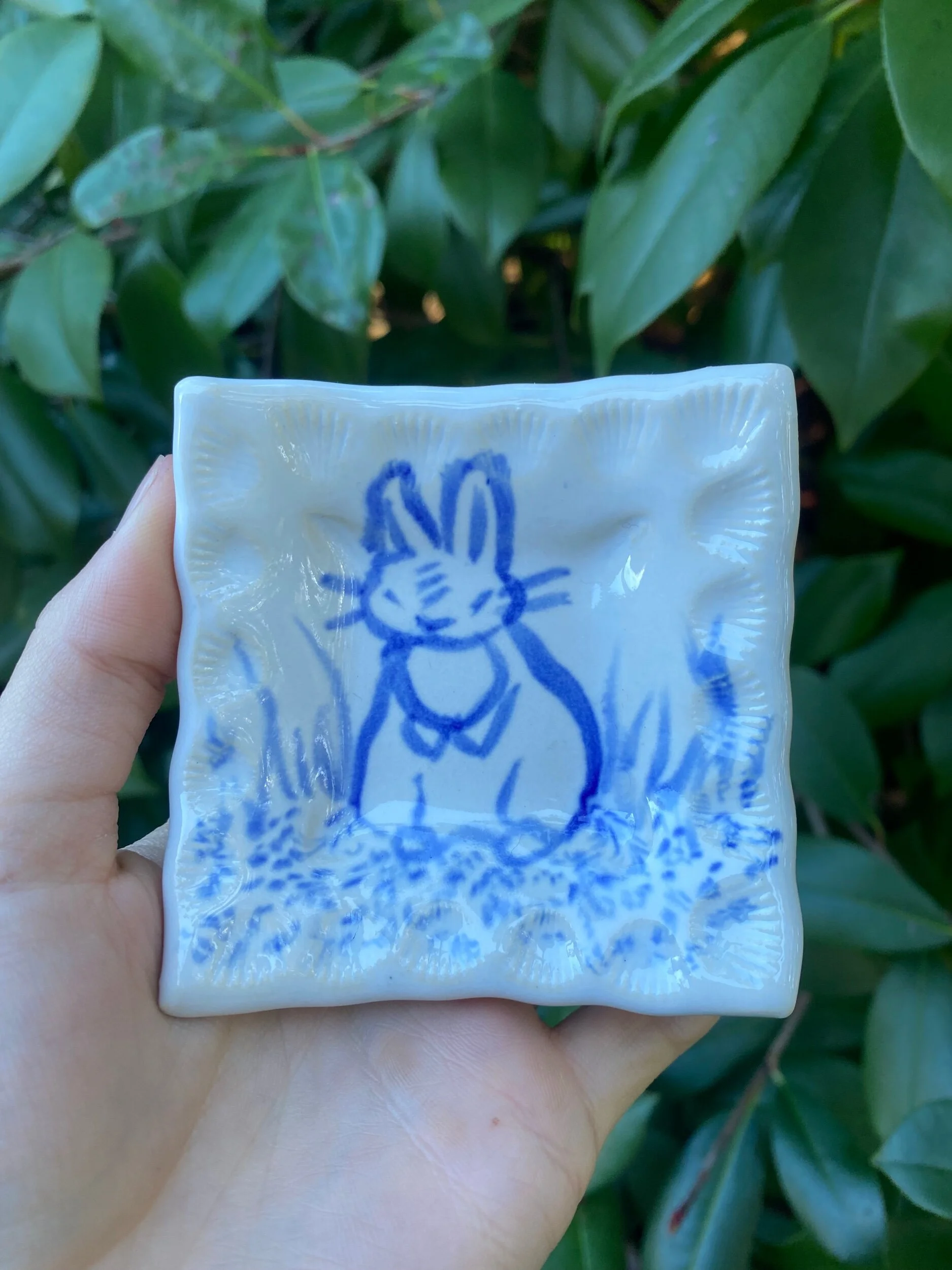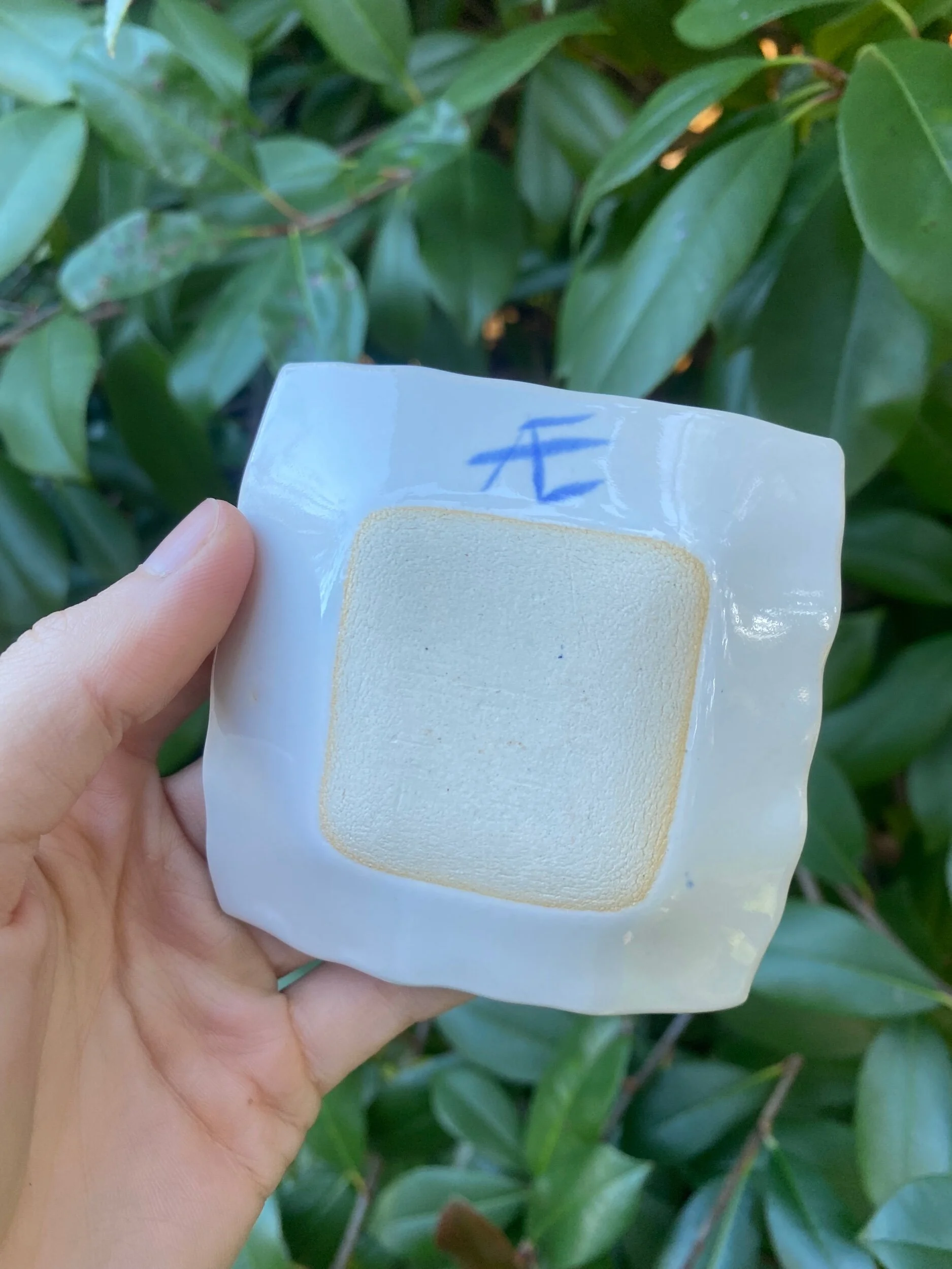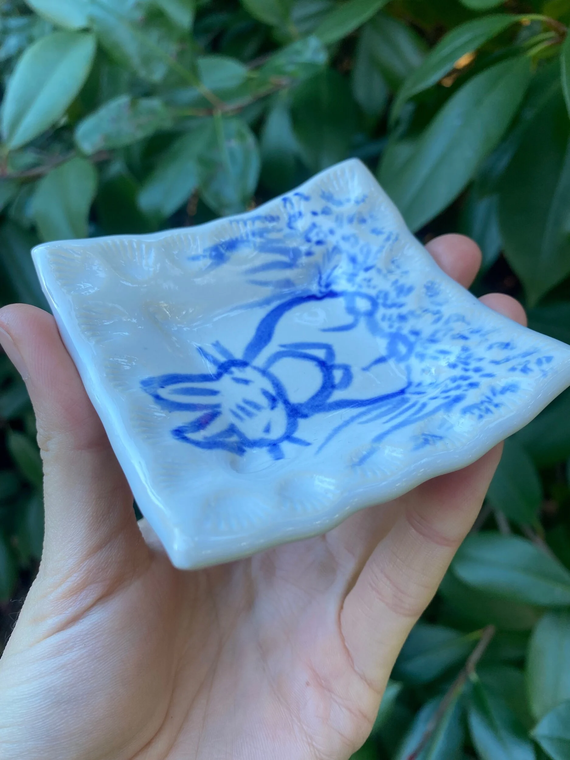 Slab built with a b-mix clay body, hand painted with cobalt oxide