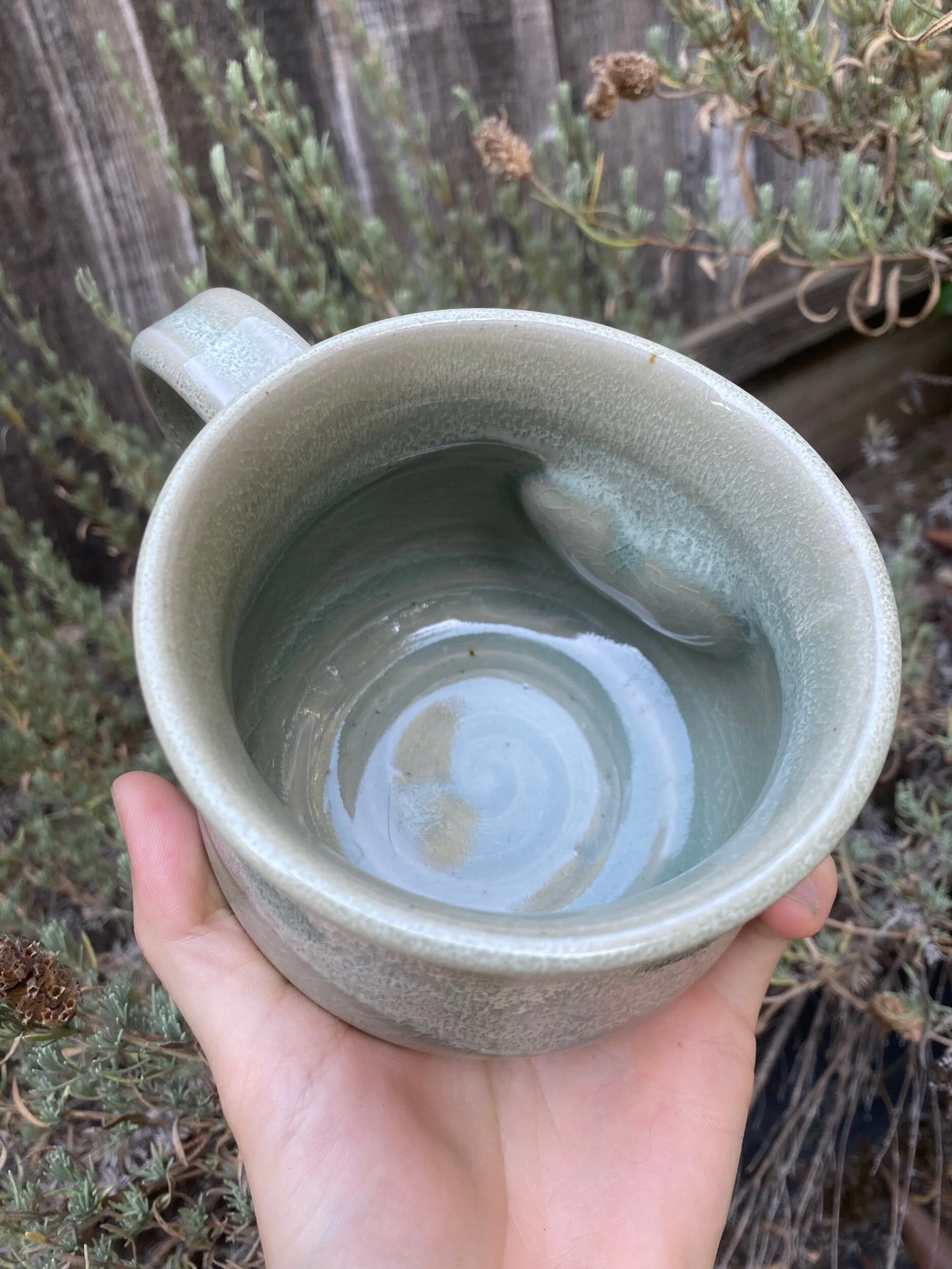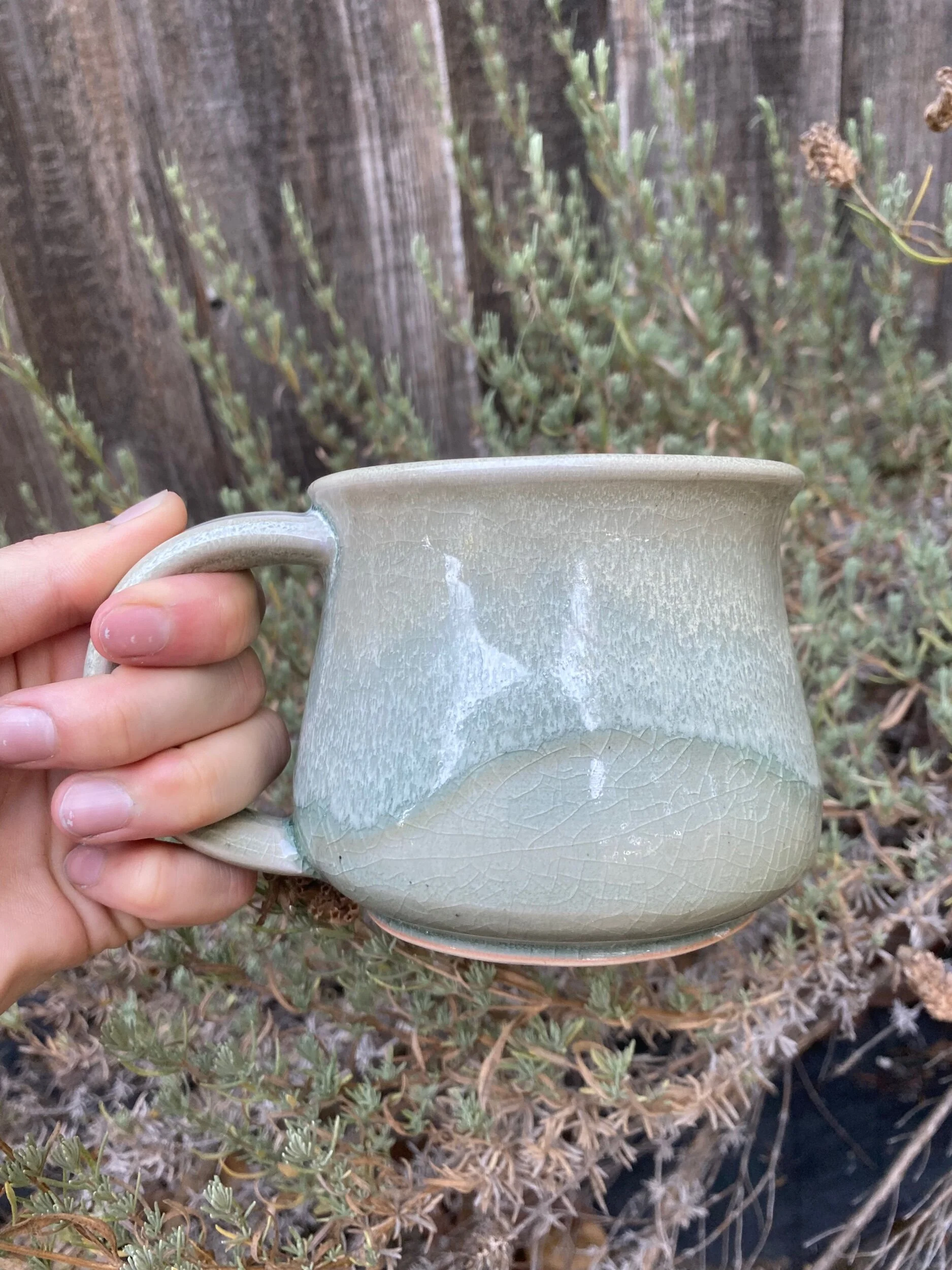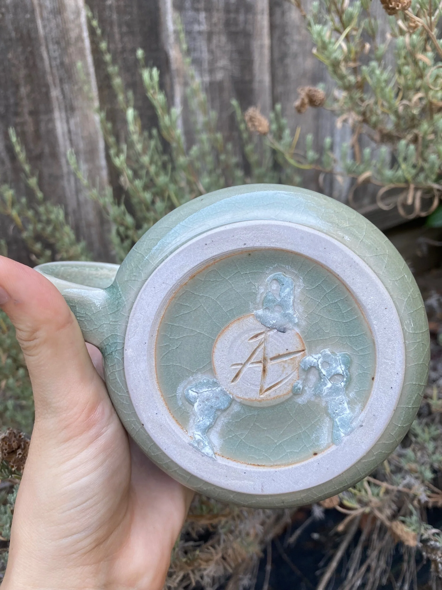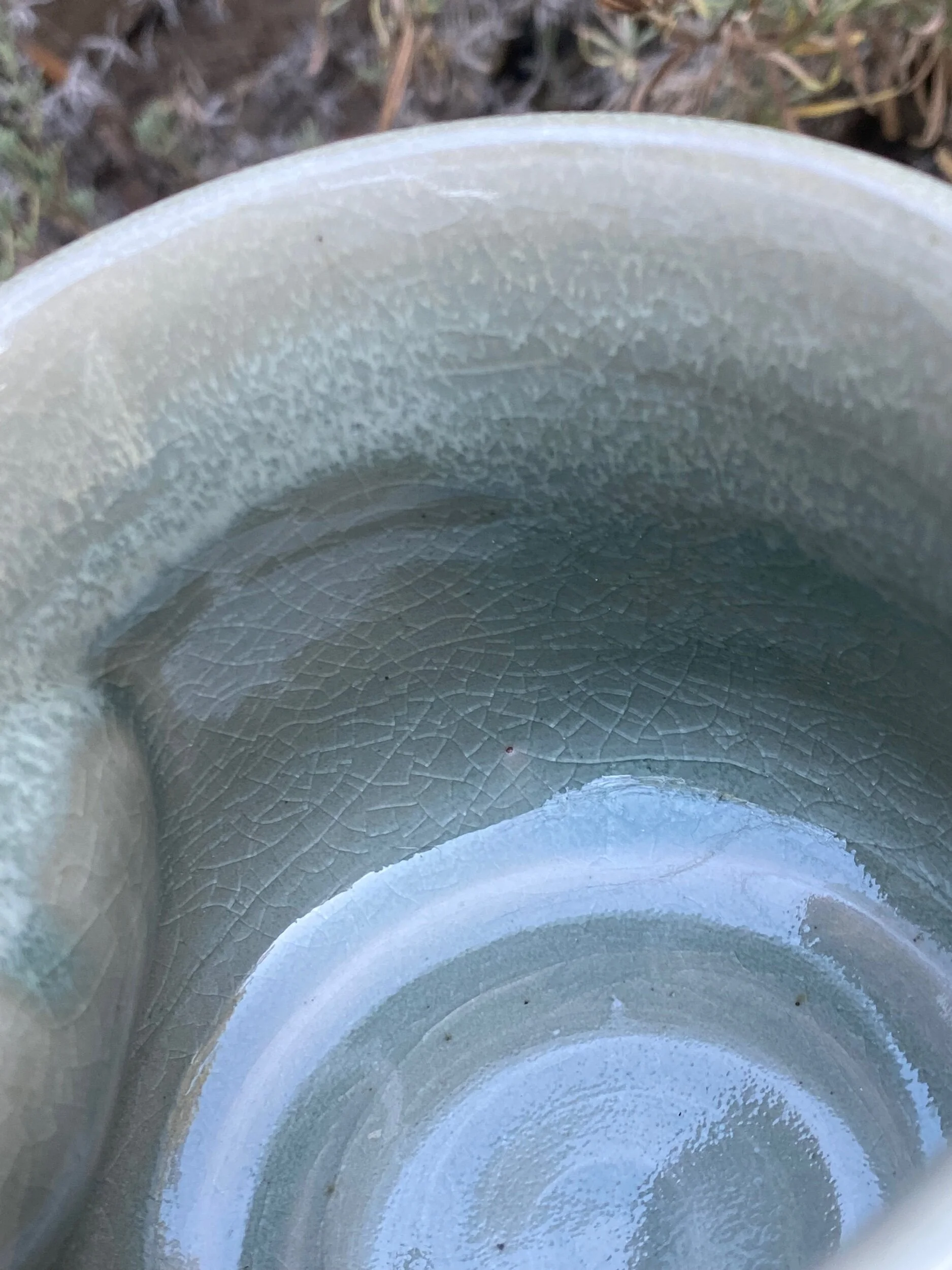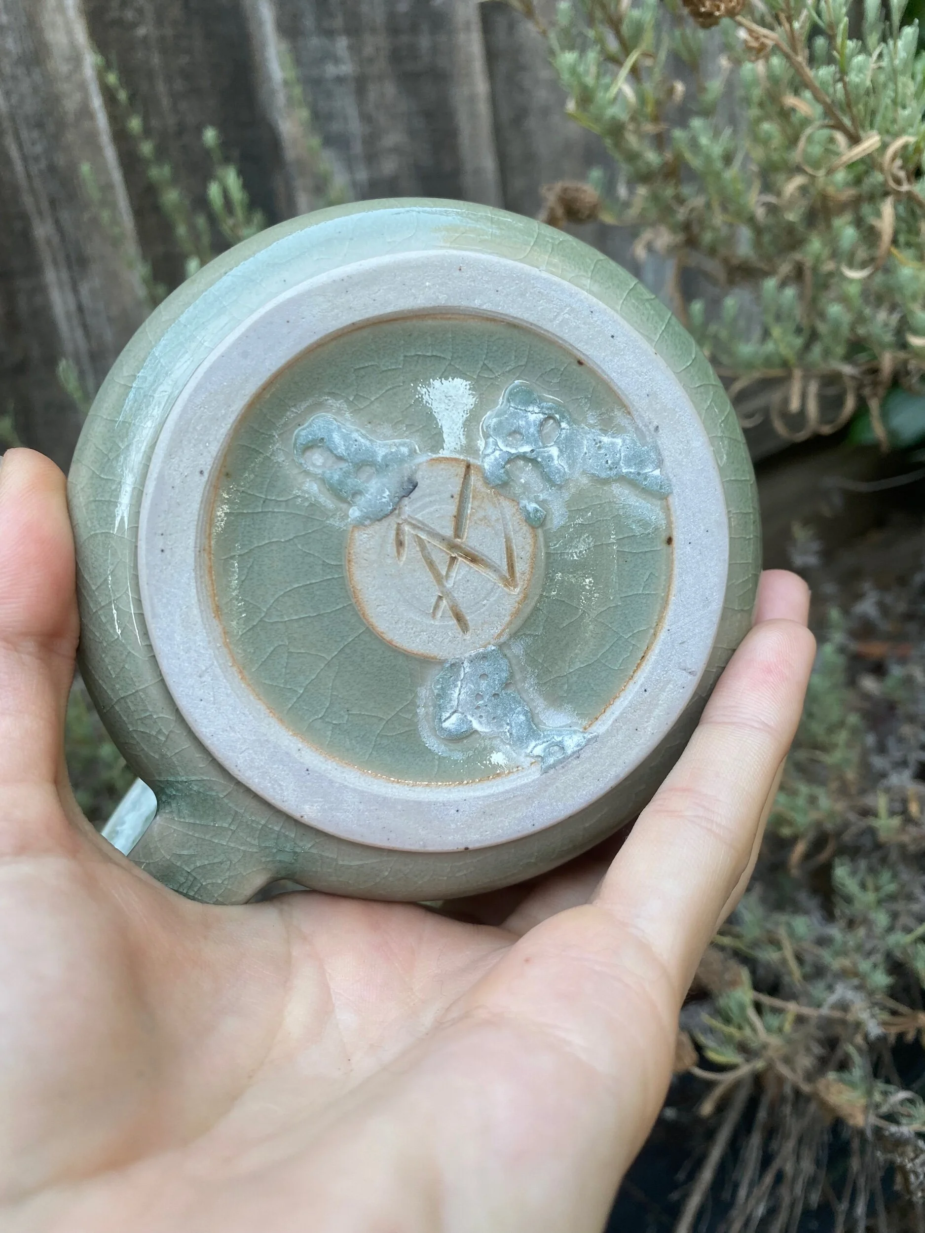 The bottom had to be ground down flat after attaching itself to a kiln shelf mid-firing. Does not change the functionality or food safety of the piece, but it does make it a little unsightly.